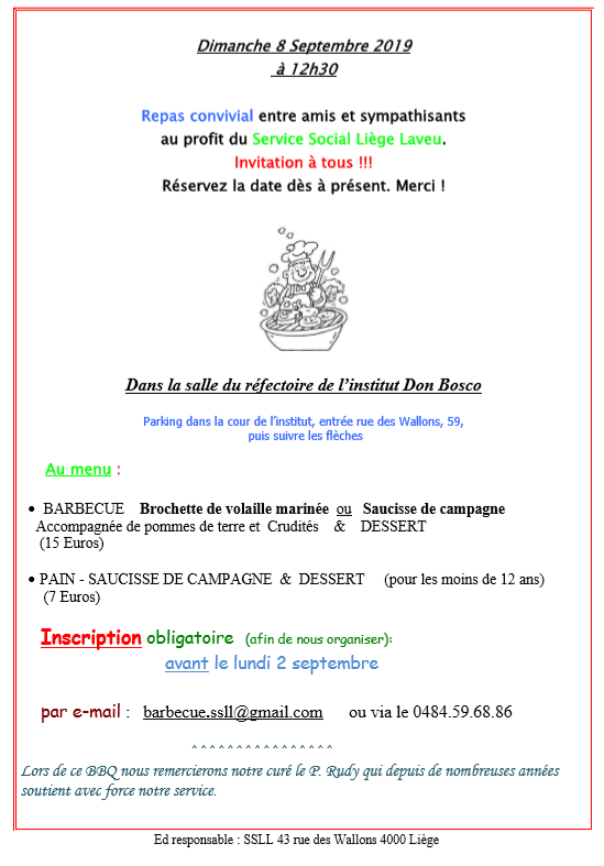 A partir de 12h45 Prolongement de la fête à DON BOSCO lors du traditionnel barbecue annuel organisé par le Service Social