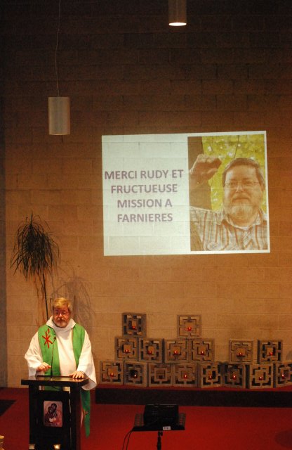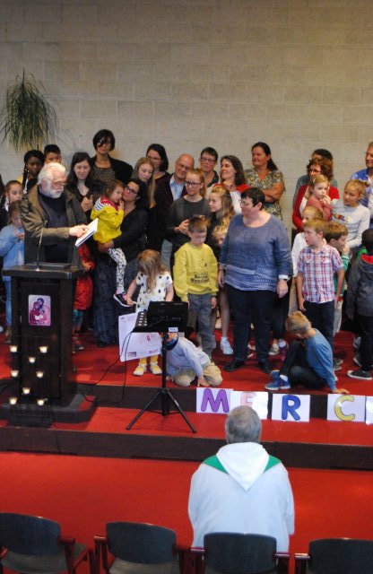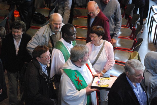 Pour clore cette partie de la célébration, la communauté a remis à Rudy trois cadeaux : un bon d’achat, un livre d’or contenant quasi une centaine de messages écrits par les paroissiens et un album photos où sont remémorés les multiples facettes des attentions de Rudy envers notre communauté.