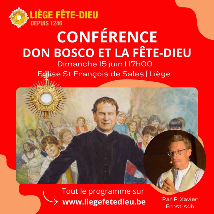 Notre Paroisse va accueillir la conférence de lancement de la semaine de la Fête Dieu (une fête qui célèbre son 779e anniversaire à Liège). Savez-vous ce qui a fini par convaincre saint Don Bosco d’ouvrir une implantation pour s’occuper de jeunes en Belgique à la fin de sa vie alors qu’il manquait de prêtres, qu’il était sursollicité et que la révolution industrielle abîmait une certaine jeunesse ? C’est lié à la Fête-Dieu.