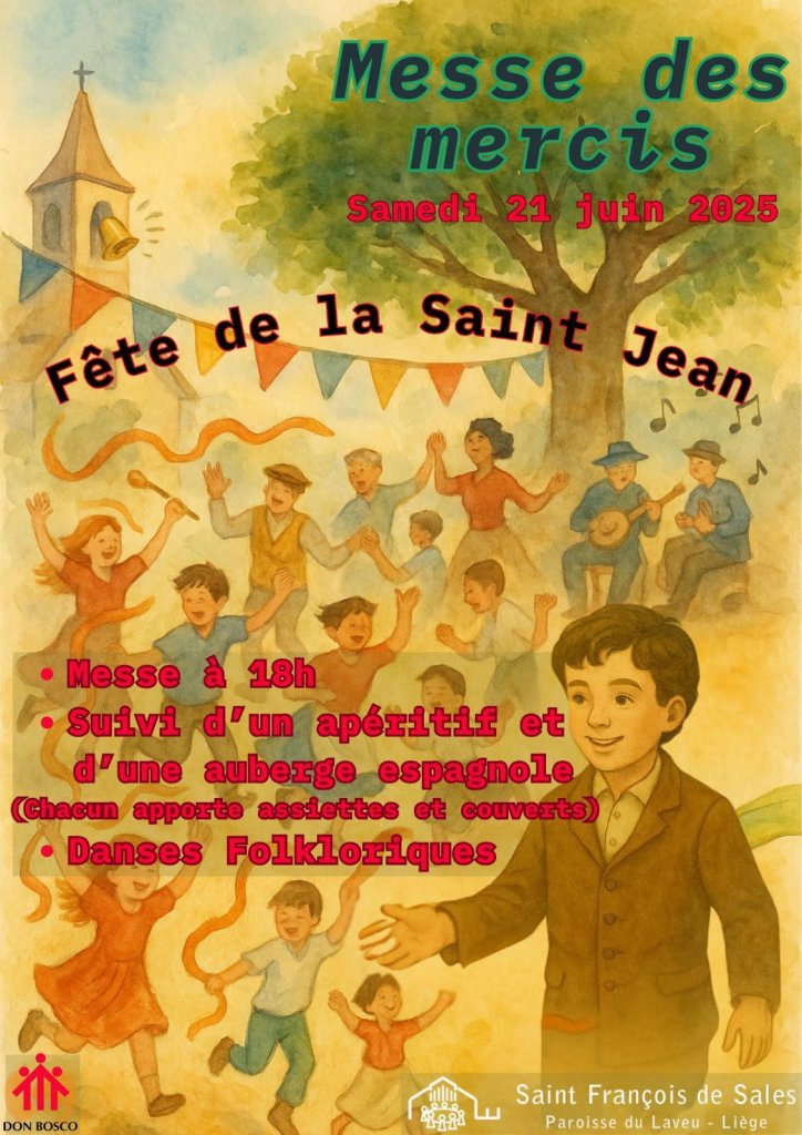 Pour terminer l’année pastorale ensemble et rendre grâce, une messe des mercis en famille paroissiale avec tous les paroissiens, les jeunes et leurs famille qui ont fait leur entrée en communion, qui ont été baptisés, qui ont célébré leur profession de foi, les confirmés de l’année, tous ceux qui participent à l’animation de cette paroisse : un temps joyeux pour dire merci à Dieu et à tous et fêter l’année partagée ensemble (avec photos de l’année) avec une belle messe animée à 18h00, un apéro offert, une auberge espagnole (chacun apporte un plat salé avec ses couverts), dessert offert et un final en danse folk autour du feu de la Saint-Jean sur le parvis de l’église.